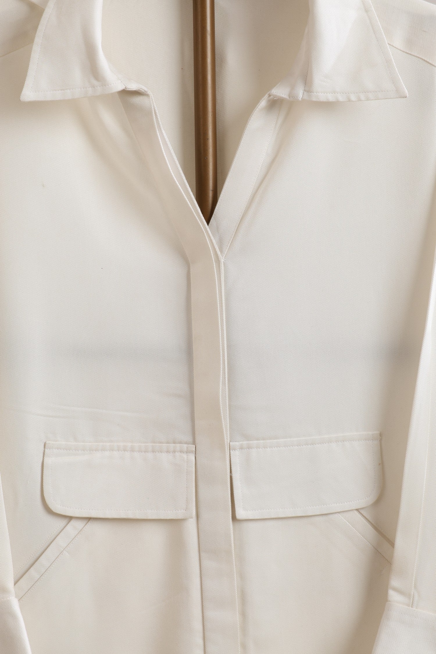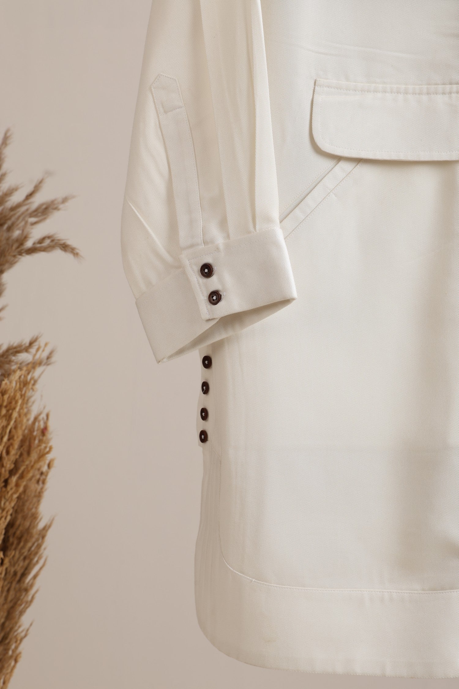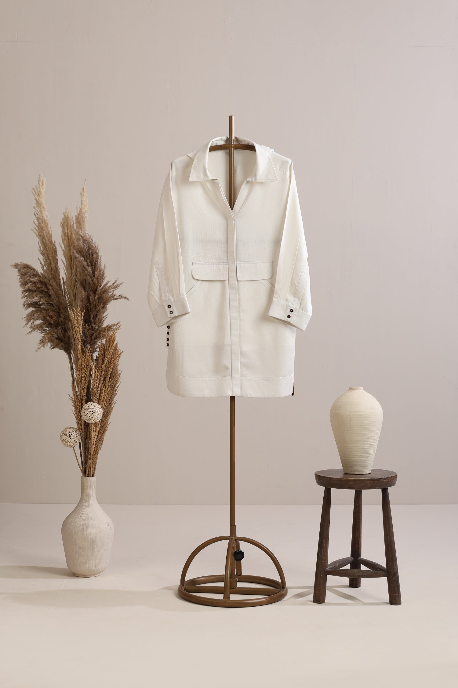 A shirt-dress reimagined with utilitarian comfort and modern tailoring. This hoodie-casual dress features a collared neckline merged with a paneled oversized hood, offering a unique balance between structure and softness. Finished with a front concealed placket, functional welt pocket at waist, and statement side seam button plackets — this piece blends transitional layering with individuality.