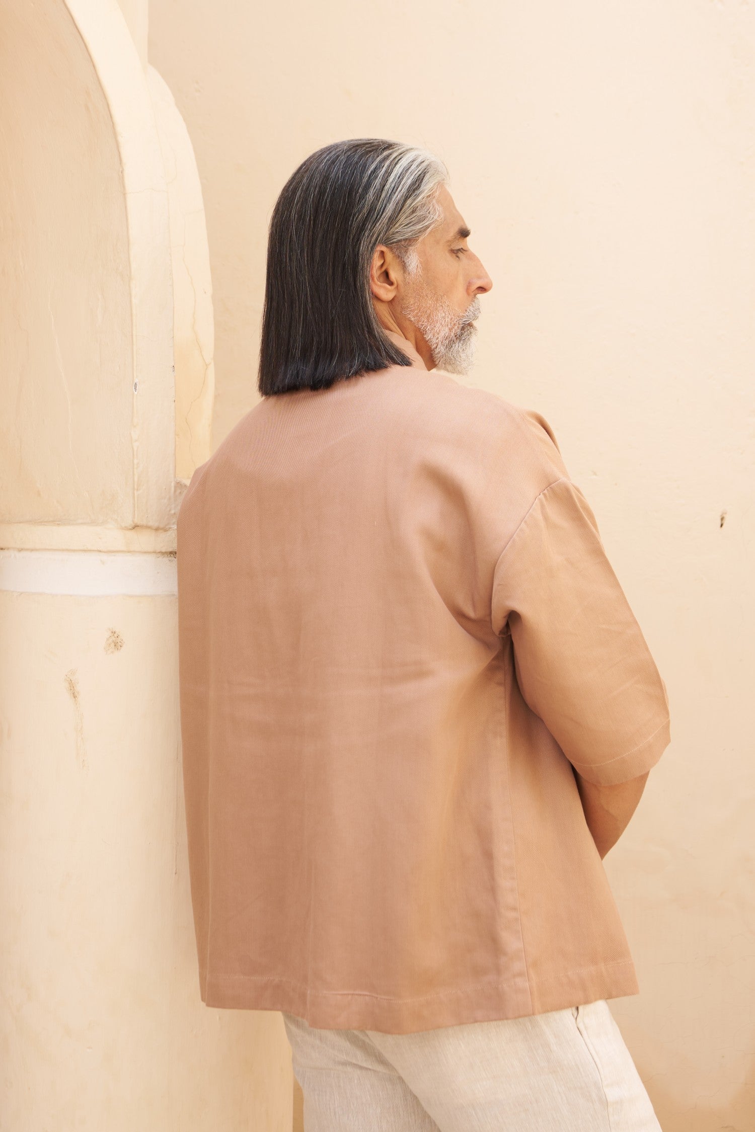 Fit: Oversized relaxed silhouette with structured shoulders, zip front, 3/4th sleeves for easy layering and functional versatility.